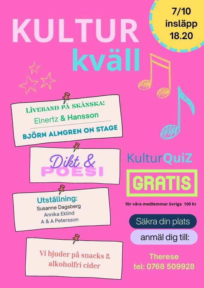 Missa inte höstens kulturkväll med härlig musik, utställning av några duktiga konstnärer i byn( både tavlor och keramik) kulturQuiz med fint pris!